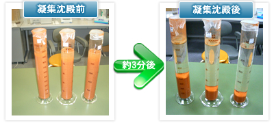 これまでの高分子凝集剤とは異なりpH調整をせずに処理でき,また脱水をすることなく処理ができることにより大幅なコストダウンが図れ,工事現場の汚泥水や有機系の豚尿などの凝集処理に使用されている